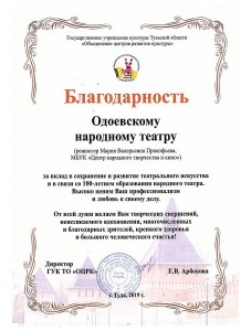 В 2015 году Одоевский народный театр подготовил театрализацию на открытие Года литературы. Был организован и проведен большой театрализованный литературный вечер. Главные роли, конечно, сыграли работники ЦНТиК, участники Одоевского народного театра.